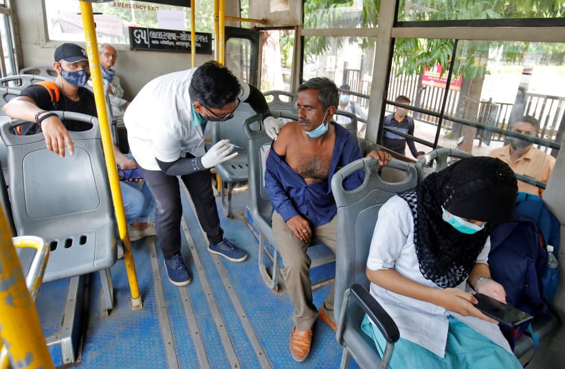A man receives a dose of the COVISHIELD vaccine against the coronavirus disease (COVID-19), manufactured by Serum Institute of India, inside a passenger bus in Ahmedabad, India, September 23, 2021