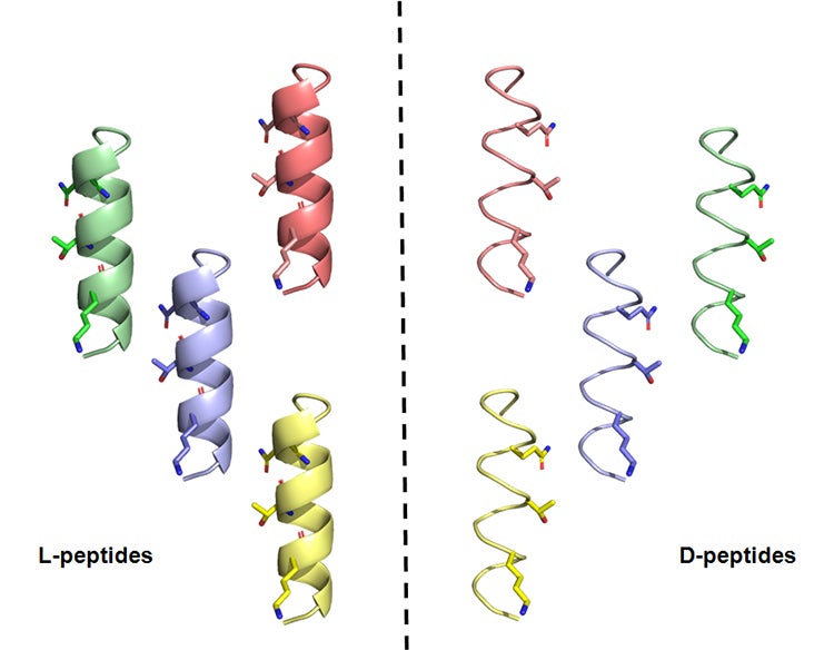An illustration of L-peptides made from naturally occurring amino acids on the left, and their synthetic mirror-image counterparts on the right (illustration courtesy of Pedro Valiente)
