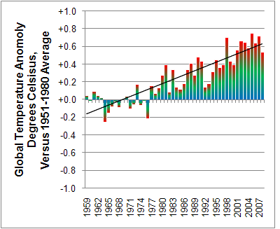 "This warmth peaked in 1998, and the temperature trend the last decade has been flat, even as CO2 has increased 5.5 percent. Cooling began in 2002. Over the last six years, global temperatures from satellite and land-temperature gauges have cooled (-0.14 F and -0.22 F, respectively). Ocean buoys have echoed that slight cooling since the National Oceanic and Atmospheric Administration deployed them in 2003."