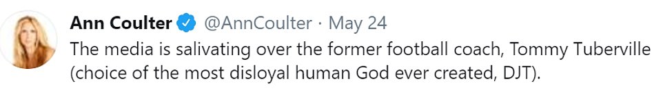 - Coulter tweeted yesterday that Sessions was 'the ONE PERSON in the Trump administration who did anything about immigration' - an issue she feels Trump betrayed voters on