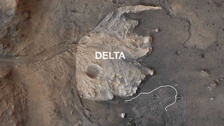 NASA’s Perseverance Mars rover will follow the proposed route to Jezero Crater’s delta shown in this animation. The delta is one of the most important locations the rover will visit as it seeks signs of ancient life on Mars. Credit: NASA/JPL-Caltech/ASU/MSSS/University of Arizona