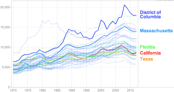 That sum inched past some developed countries and far surpassed others. Switzerland's total spending per student was $14,922 while Mexico averaged $2,993 in 2010. The average OECD nation spent $9,313 per young person.