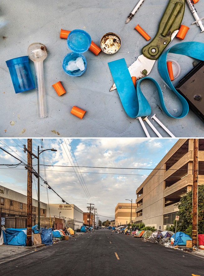 Meth and paraphernalia (above) inside a tent on Skid Row, in Los Angeles. The area encompasses about 50 square blocks of the city; tents (below) line many of its streets. (Rachel Bujalski for The Atlantic)