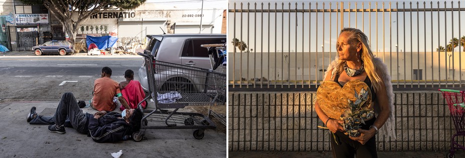 Left: A couple sits on a Skid Row sidewalk while a man sleeps next to them. Right: A woman near her tent in L.A., holding a wooden heart she found while searching for recyclables. She wants to kick her meth habit, she says, but cannot stop using. (Rachel Bujalski for The Atlantic)