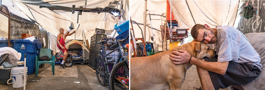 Left: A man inside his encampment on a Skid Row sidewalk, after taking a puff of meth. Right: Another resident of the same encampment, who attributes his homelessness to a cycle of meth use he cannot break. (Rachel Bujalski for The Atlantic)