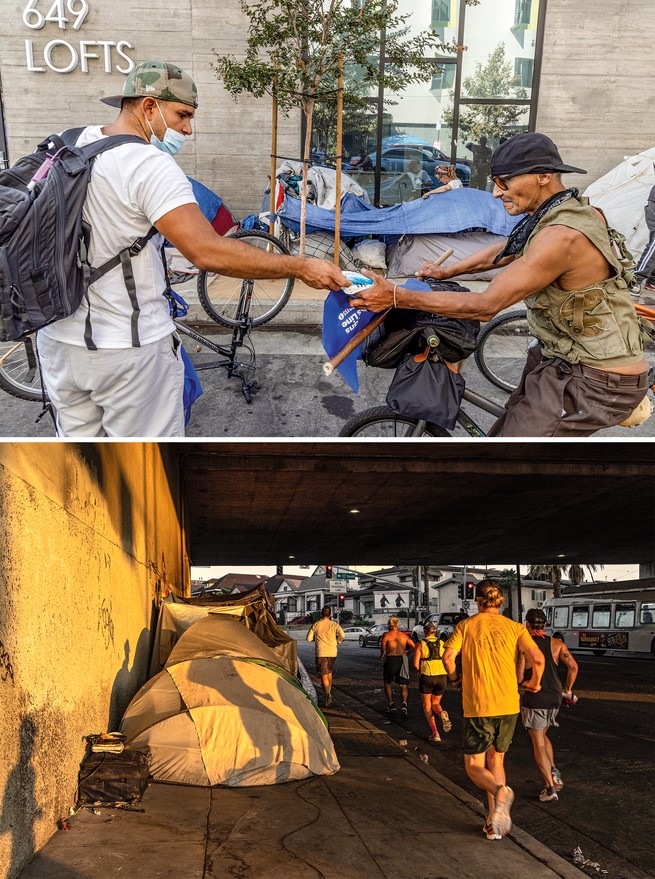 Top: Barrera, distributing socks on Skid Row. Bottom: The Skid Row Running Club—recovering addicts, cops, social workers—seeks to support the area’s homeless through mentorship and a focus on wellness. (Rachel Bujalski for The Atlantic)