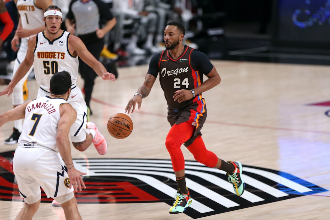 Trail Blazers wing Norman Powell (#24) pushes the ball up the court as the Portland Trail Blazers face the Denver Nuggets at Moda Center in the final game of the regular season on Sunday, May 16, 2021.Sean Meagher/The Oregonian