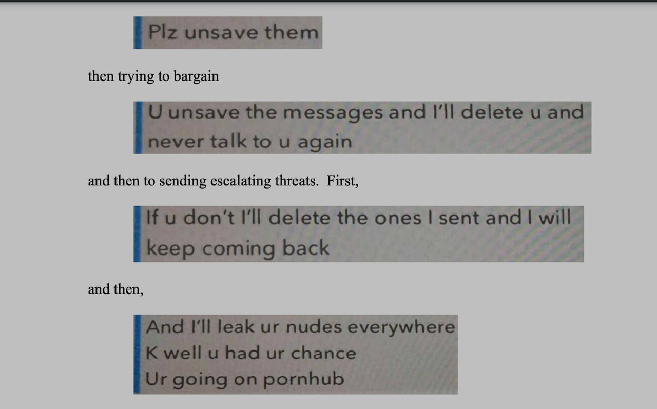 In another message, he wrote, “I’ve already talked with my attorney about it. And he assured me that we can make life a living hell for you if you decided to go to the police.”