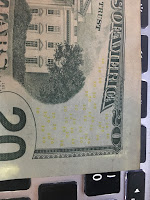 Printers have two features put in there by the government to be evil to you. The first is that they recognize a barely visible pattern on currency, so that they can't be used to counterfeit money, as shown on this $20 below: