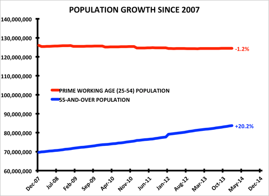 Dividing 5.5 million by 12.6 million suggests around 44% of the drop in labor force participation since 2007 is retiring workers. Add the 2.3 million workers over the age of 50 who have left the workforce because of disability in that time period and the numbers suggest closer to 62% of the drop in labor force participation over the last six years can be attributed to an aging population.