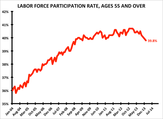 At 39.8%, the labor force participation rate for those 55 years of age and over is the lowest it's been since April 2009 (chart 1).