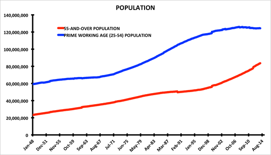 Millions of Americans have been transitioning from the first bucket (25-54) to the second one (55+) over the past several years as the baby boom generation comes of retirement age.