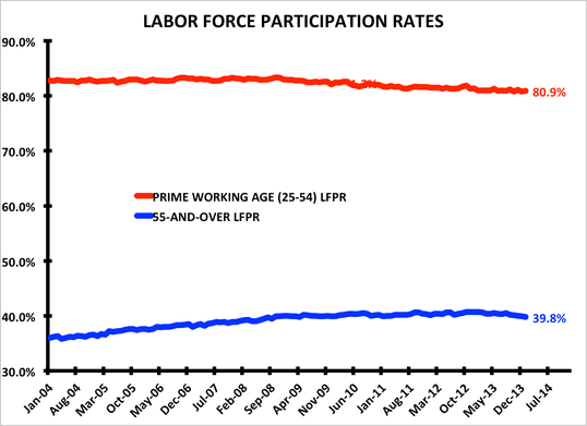 Of course, the labor force participation rate for those 55 years of age and over has only been falling for the last year, whereas the total labor force participation rate has been falling for over five years.