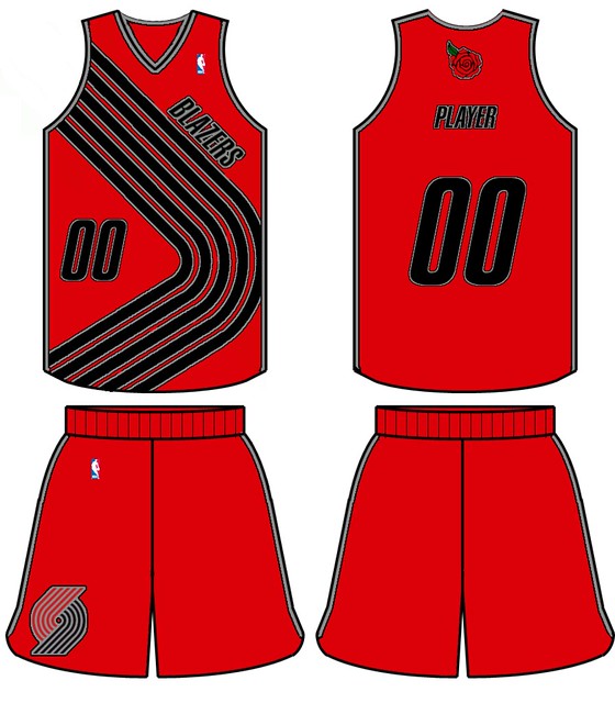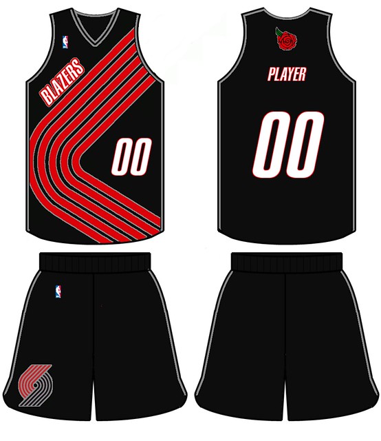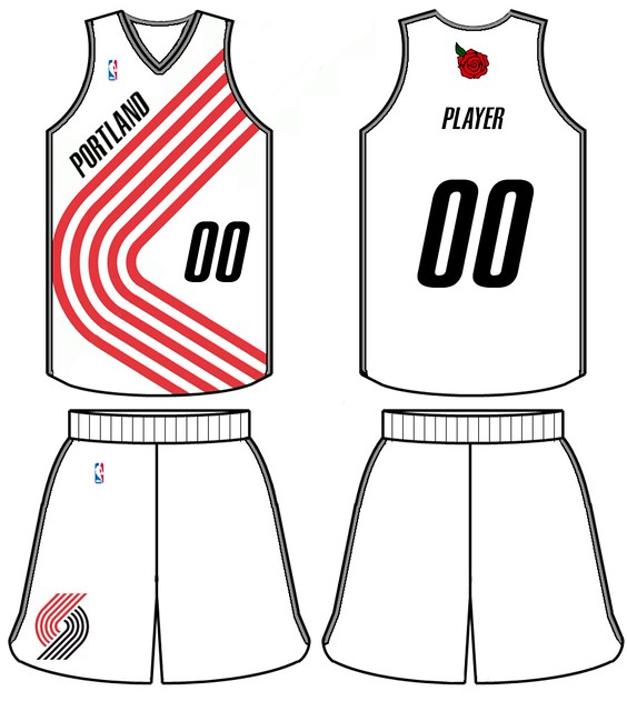 Diagonal-Striping Honorable Mentions: You have to look closely to see it, but Thomas Fiers incorporated a pinwheel into his diagonal striping. The best of both worlds! ... Andrew von Haslingen used diagonal striping as the basis for a Portland skyline treatment. ... Dan Kennedy used a diagonal motif for an interesting set of color-blocked uniforms. ... Duke Stebbins used the diagonal concept to come up with a set that looks more like a soccer uni or a track and field uni. Not bad, although not really suited for the basketball court. ... Subtle move by Chris Giorgio, who put his diagonal stripes on the shoulder straps. He also used Portland's "Rose City" nickname to create a rose-themed logo, a rose-patterned alternate, and -- get this -- a rose accented NBA logo.