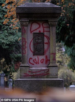 - A statue on top of the memorial was also toppled and sprayed with red paint